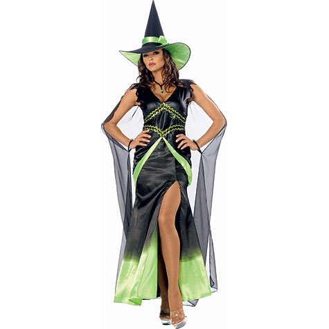 This green witch is fierce, fantastic... fabulous! Fabulous Green Witch costume features fitted dress with bust made of stretch shiny polyester for best fit, skirt made of dip-dye satin, and sequin trim embellishments. Attached to dress is chiffon cape with elastic wristbands.